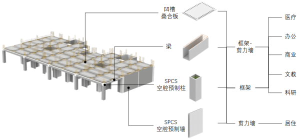 研發(fā)培訓大樓采用了多種預制構(gòu)件,其中包括SPCS疊合柱、疊合梁、疊合板、預制樓梯等。多種預制構(gòu)件的應用,體現(xiàn)了SPCS體系高度的工業(yè)化程度,也展示了三一筑工在新技術(shù)、新材料、新工藝、新裝備等方面的諸多成果。